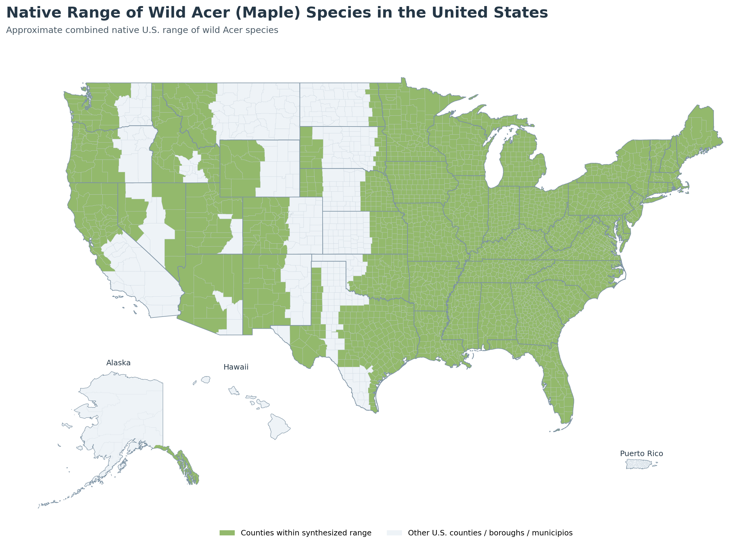North American maples occur across most temperate climates from Alaska and Canada to northern Mexico and the Caribbean. In the United States and Canada, the highest diversity occurs in the eastern deciduous forest region, where several species often coexist.1 Western North America supports fewer species but includes several distinctive regional maples. Puerto Rico has only limited representation of the genus, primarily through cultivated ornamental species rather than native populations.