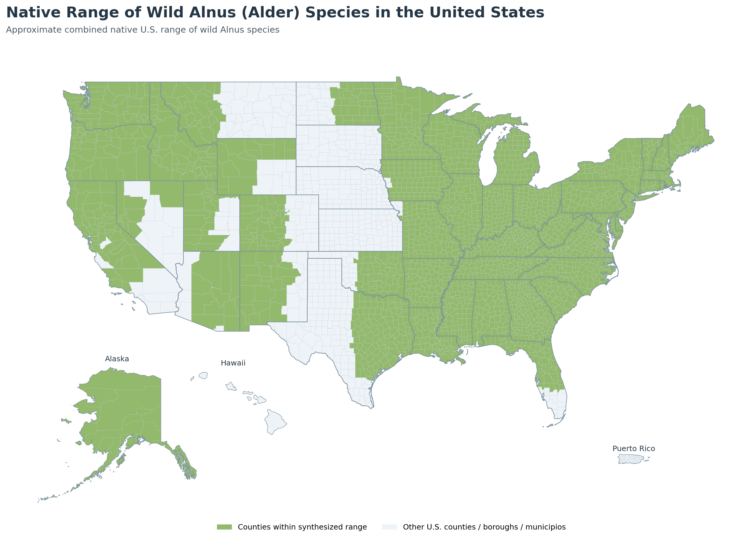 The map below summarizes the approximate combined native U.S. range of wild alder species. It is a county-shaded cartographic synthesis for public education, not a verified county occurrence atlas for each species.1,2