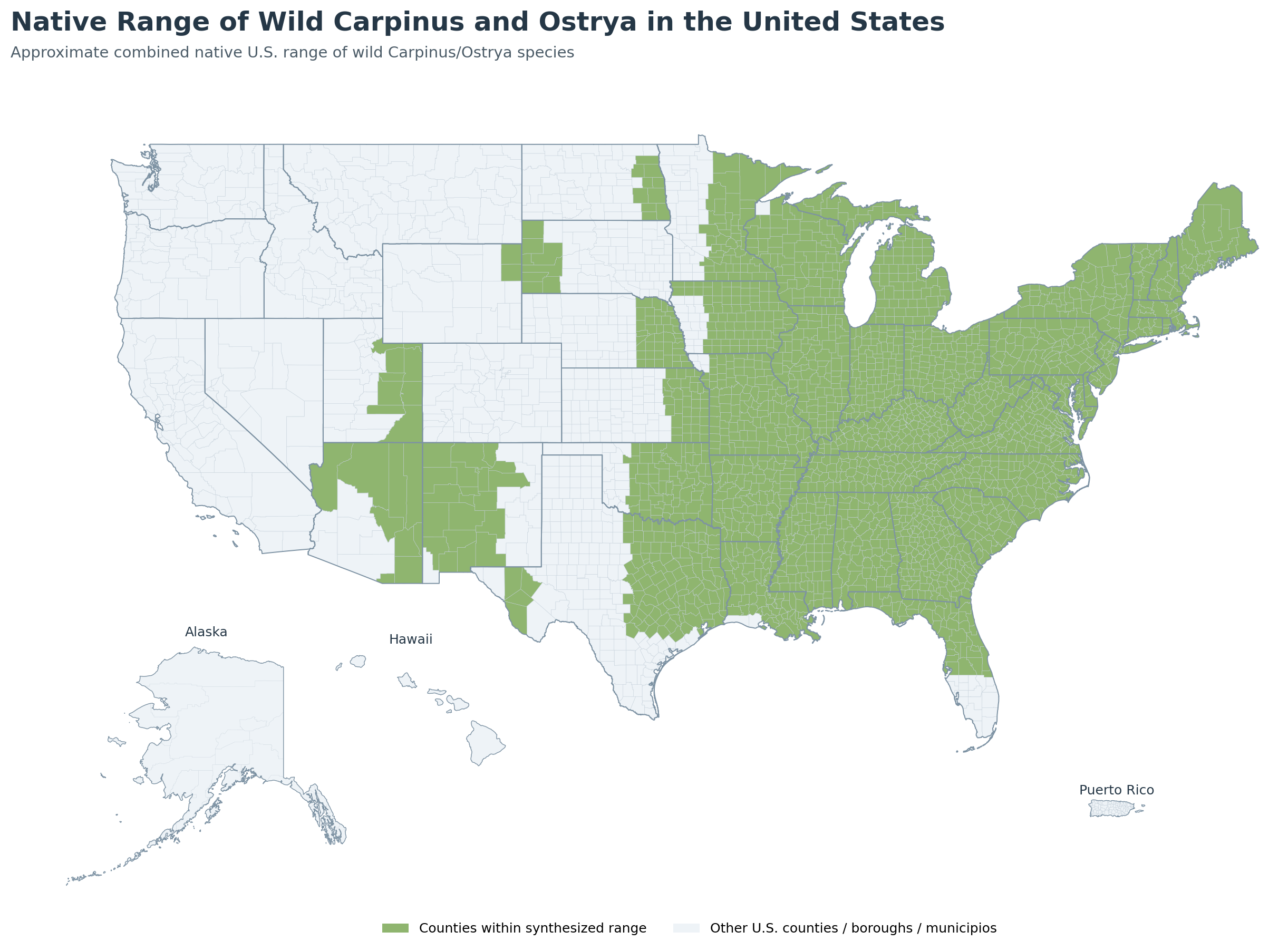 Map notes: This map follows the combined native U.S. range of wild Carpinus and Ostrya species rather than ornamental plantings.